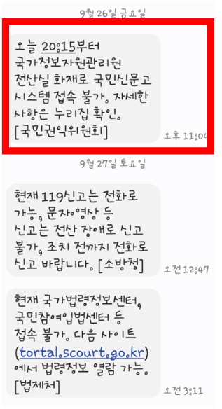 잠시 후 국가정보자원관리원 화재 발생이라는 또 다른 재난문자가 도착했고 이는 곧 전국 행정 시스템 마비 사태로 이어졌습니다.