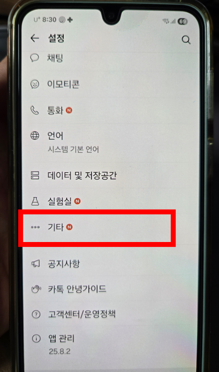 설정 화면 아래로 쭉 내려보면 기타라는 항목이 있어요. 여기를 터치!