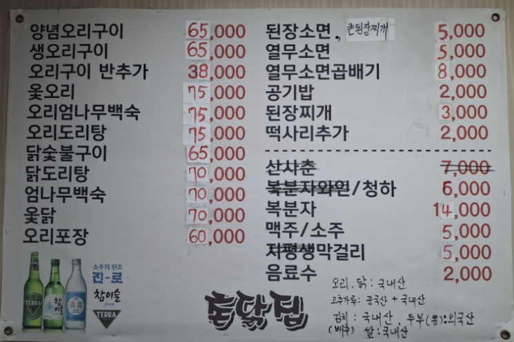 이 집의 메인 메뉴는 생오리구이와 양념오리구이 두 가지입니다.