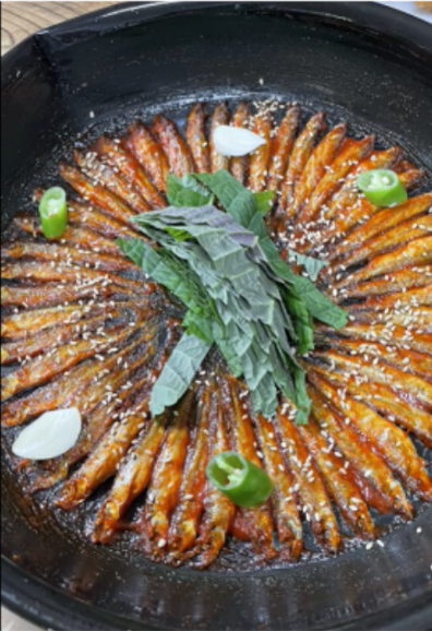 도리뱅뱅이는 충청 지역 특유의 음식으로 양념된 민물고기를 둥글게 배열해 구운 요리인데 자극적이지 않으면서도 감칠맛이 있어 국수와 궁합이 아주 좋습니다.