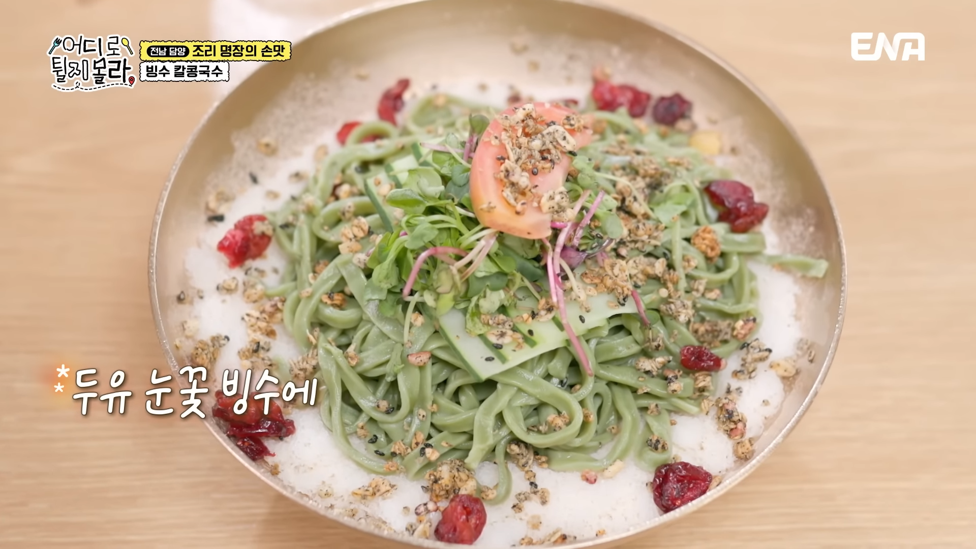 고소한 콩국수에 얼음을 듬뿍 넣어 마치 빙수처럼 즐길 수 있도록 만든 메뉴예요.