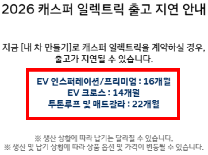 | 16~22개월 이상 대기 | 캐스퍼 액티브 트림 및 전기차 |