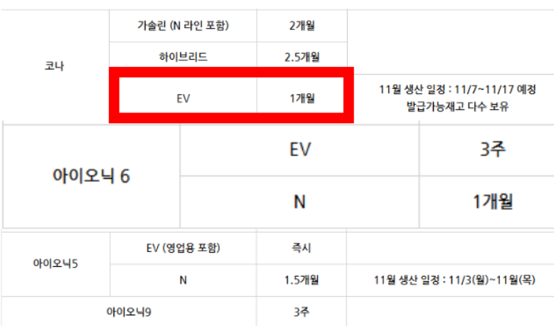 | 2~3개월 대기 | 팰리세이드, 일부 코나 하이브리드 |
