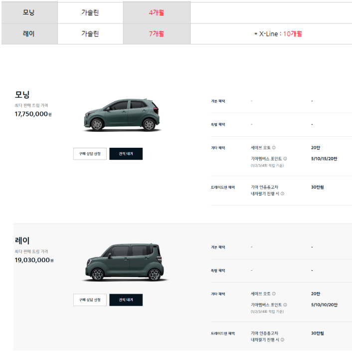 모닝 가솔린 모델은 출고 대기 기간이 다소 줄어든 편입니다.